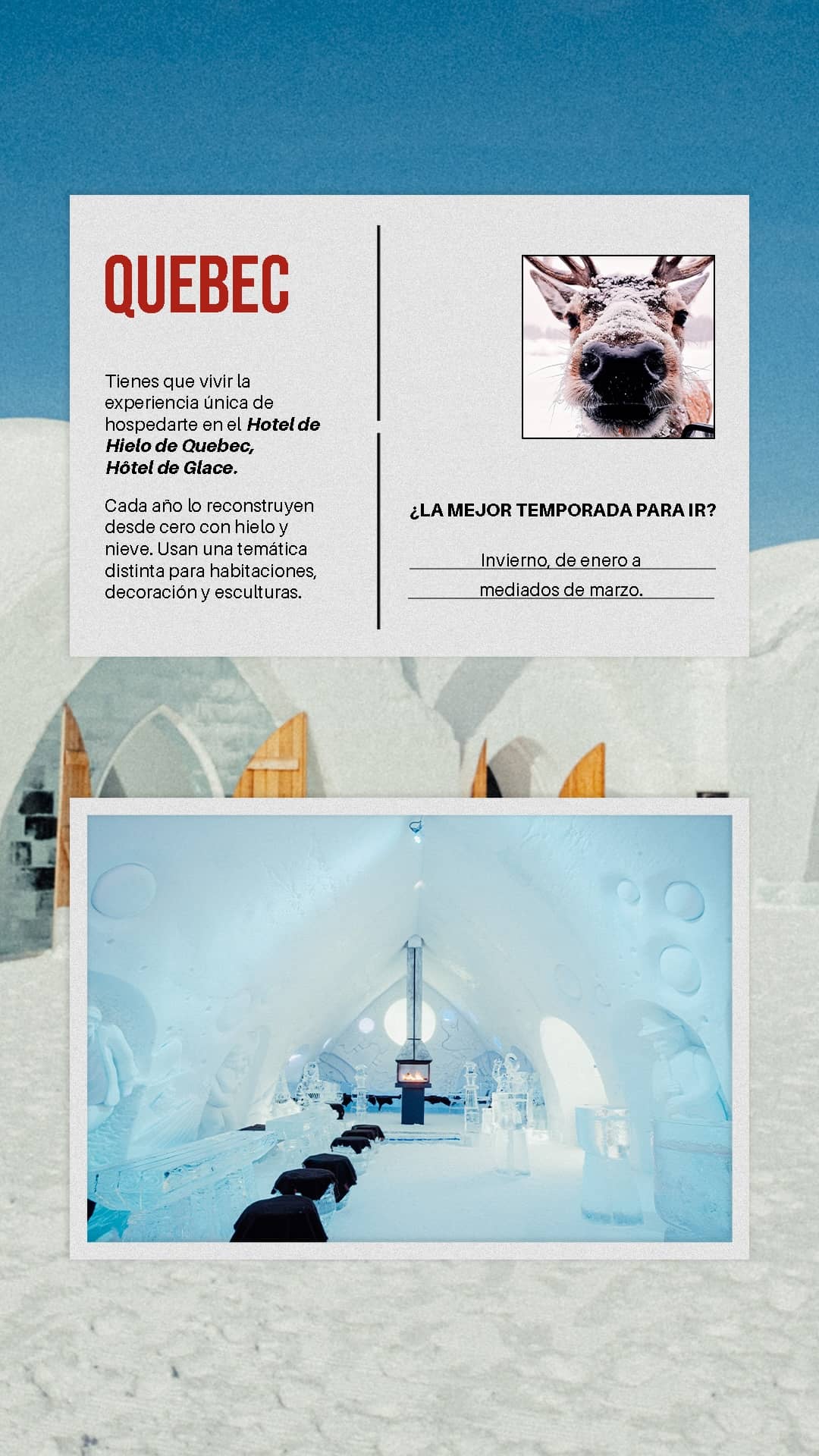 Podrás hospedarte a partir de $479 CAD por noche e incluye sleeping bag, sábanas aislantes, acceso al spa y áreas comunes como el bar. Puedes visitarlo sin tener que pasar la noche, hay tours para conocerlo, admirar sus esculturas y terminar con un drink en su famoso bar de hielo.